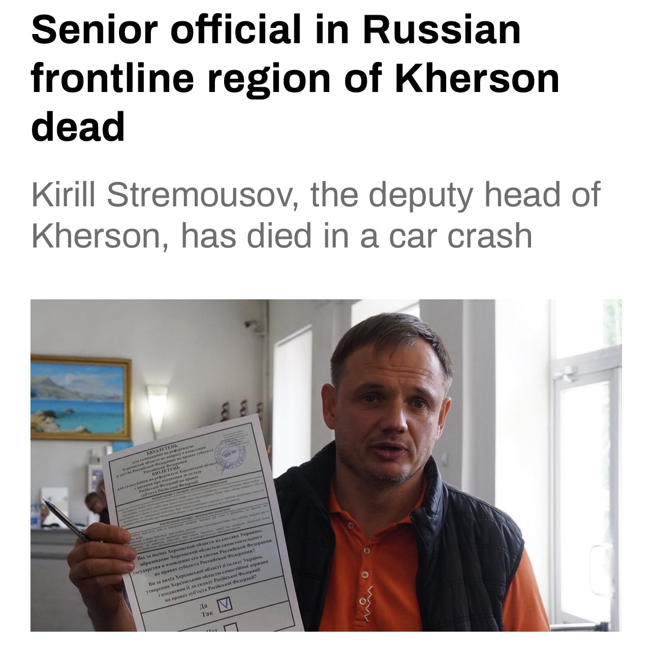 The TASS news agency said the. Kirill Stremousov the Russian-installed deputy head of the collaborationist administration in Ukraines partially-occupied Kherson region was involved in a car accident. The occupation deputy head of the Kherson region Kirill Stremousov has died in a road accident.